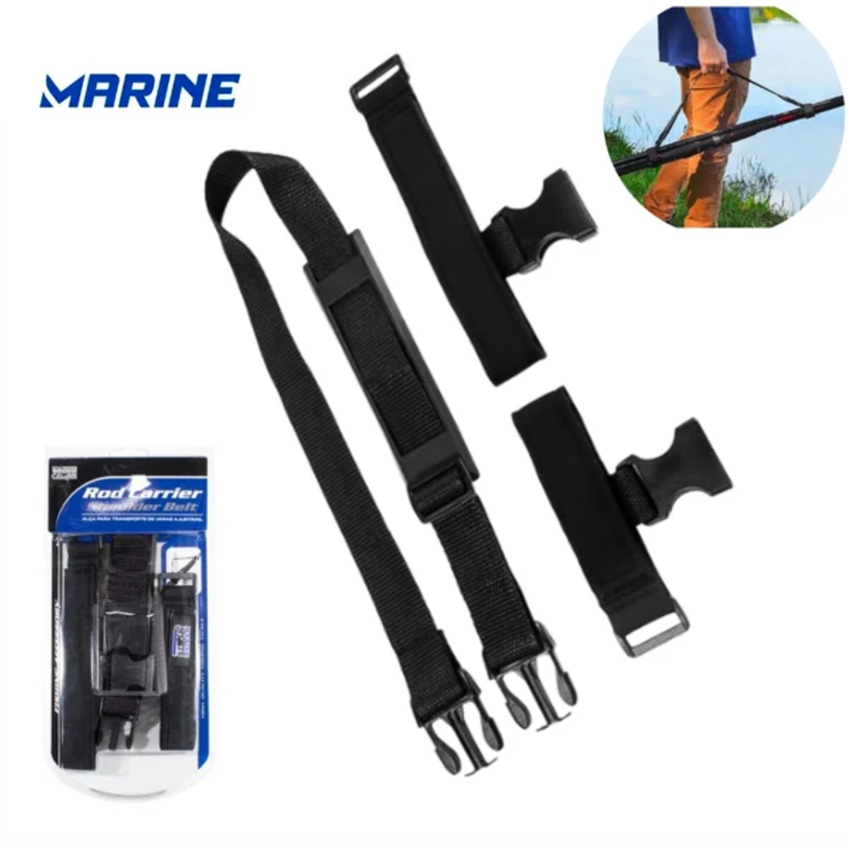 Alça regulável com engate rápido e cinta confeccionada em neoprene para auxiliar no transporte de varas.